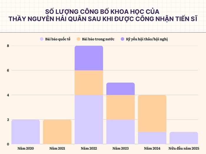 Số lượng công bố khoa học của thầy Nguyễn Hải Quân sau khi được công nhận tiến sĩ. Biểu đồ: Gia Hân.