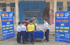 Tại khuôn viên trường Tiểu học và Trung học cơ sở Nhơn Thạnh, phường Phú Khương, tỉnh Vĩnh Long, không khí trở nên rộn ràng hơn thường lệ. Các em học sinh tay cầm những bao rác thải nhựa đã được phân loại gọn gàng – nào chai nhựa, ly nhựa, túi nilon… Tất cả được mang đến để đổi lấy những phần quà là dụng cụ học tập trong chương trình “Đổi rác thải nhựa lấy quà tặng”.