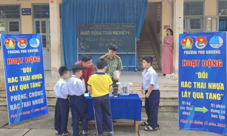 (HNTTO) – Hưởng ứng phong trào phòng, chống rác thải nhựa và bảo vệ môi trường, Đoàn phường Phú Khương, tỉnh Vĩnh Long phối hợp với Hội Liên hiệp Thanh niên và Hội đồng Đội phường tổ chức chương trình “Đổi rác thải nhựa lấy quà tặng”. Hoạt động ý nghĩa này đã thu hút đông đảo các em học sinh tham gia, góp phần nâng cao ý thức cộng đồng trong việc phân loại, tái chế rác thải và xây dựng nếp sống xanh.