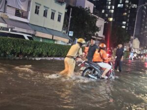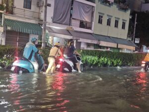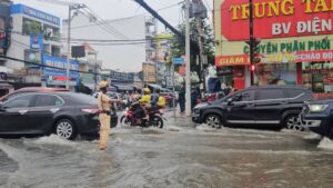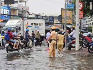 (HNTTO) – Trong tình hình triều cường dâng cao, tình trạng ngập nước tại một số tuyến đường diễn ra nghiêm trọng trong những ngày qua, dẫn đến người dân đi lại khó khăn, nhất là tình trạng mưa lớn kéo dài khi vào khung giờ cao điểm, lượng phương tiện tập trung đông đúc vì người dân đi làm, về nhà và đưa đón con đi học dẫn đến giao thông di chuyển khó khăn, tiềm ẩn nhiều nguy cơ gây mất TTATGT.