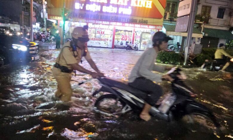 Theo đó, phát huy tinh thần “Vì nhân dân phục vụ”, lực lượng CSGT kịp thời có mặt, lội nước điều tiết giao thông, hỗ trợ phương tiện chết máy, giúp người dân thoát khỏi điểm ngập sâu. Điển hình, tại tuyến đường Huỳnh Tấn Phát, đoạn qua phường Phú Thuận và giao lộ Huỳnh Tấn Phát – Phú Thuận, mặt đường chìm trong biển nước. Đặc biệt, các chiến sĩ còn nỗ lực đẩy các phương tiện bị chết máy do ngập nước vào vị trí an toàn, giúp người dân sớm thoát khỏi vùng ngập.