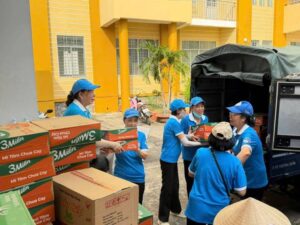 Bên ngoài sân, không khí càng khẩn trương hơn khi những chuyến xe tải chờ sẵn để nhận hàng cứu trợ. Các chị em phối hợp với lực lượng địa phương chuyền tay nhau từng thùng carton, từng bao gạo, bao quần áo, và các nhu yếu phẩm. Một hàng người nối dài, từng món quà được đưa lên xe bằng tất cả sự trân trọng và yêu thương. Khi tất cả hàng hóa đã được sắp xếp hoàn chỉnh và những chuyến xe đầu tiên lăn bánh, phía sau là ánh mắt dõi theo đầy hy vọng của các hội viên. Ánh mắt ấy chất chứa niềm tin và kỳ vọng rằng những phần quà tuy nhỏ bé nhưng trọn vẹn tình người sẽ tiếp thêm sức mạnh cho đồng bào miền Trung vượt qua khó khăn, sớm ổn định cuộc sống.