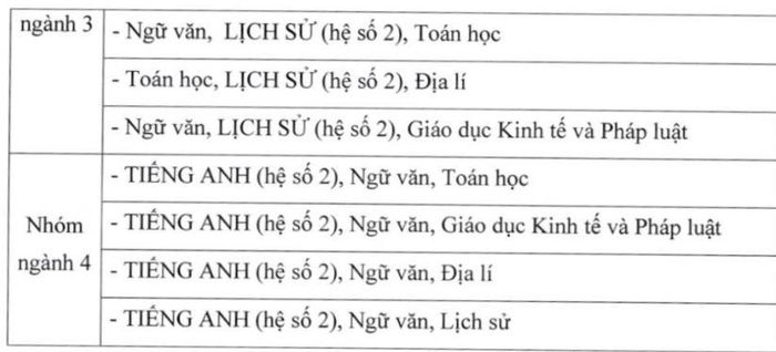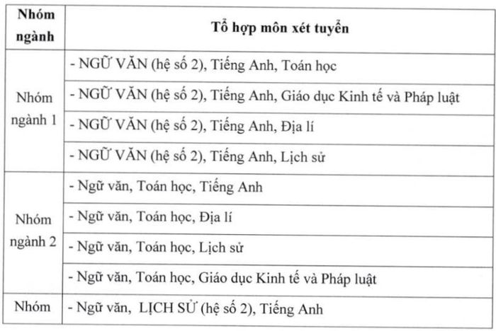 Phương thức cuối cùng là xét điểm thi tốt nghiệp THPT. Nhóm ngành 2 tổng điểm xét tuyển là 30, không môn nào nhân hệ số. Trong khi đó, nhóm 1 có môn Ngữ văn, nhóm 3 có môn Lịch sử, nhóm 4 có môn Tiếng Anh sẽ nhân hệ số 2, tổng điểm xét tuyển là 40. Tổ hợp xét tuyển như sau: