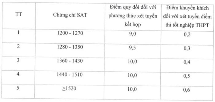 Trường chấp nhận quy đổi điểm chứng chỉ IELTS để thay thế môn tiếng Anh trong tổ hợp, mức quy đổi như bảng trên. Nếu có chứng chỉ SAT, thí sinh được cộng khuyến khích 0,2-0,6 điểm vào tổng điểm xét.