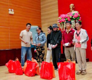 Ông Phan Khôi Tường và ông Hồ Minh Sơn – Viện trưởng Viện Nghiên cứu Thị trường – Truyền thông Quốc tế (IMRIC); Phó Chủ tịch, Tổng Thư ký Hiệp hội trao quà cho người dân