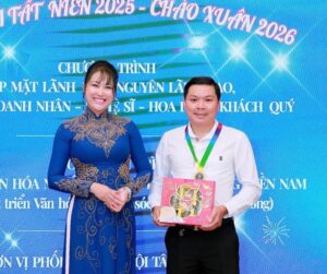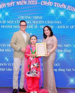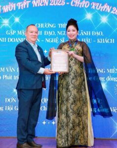Ông Phạm Đình Vương – Trưởng Văn phòng Đại diện Trung ương Hội Giáo dục và Chăm sóc Sức khỏe Cộng đồng Việt Nam; Giám đốc Trung tâm UNESCO Văn hóa và Thông tin Truyền thông trao bảng ghi nhận vinh danh cho gia đình Doanh nhân Văn Hùng và bà Hải Khanh